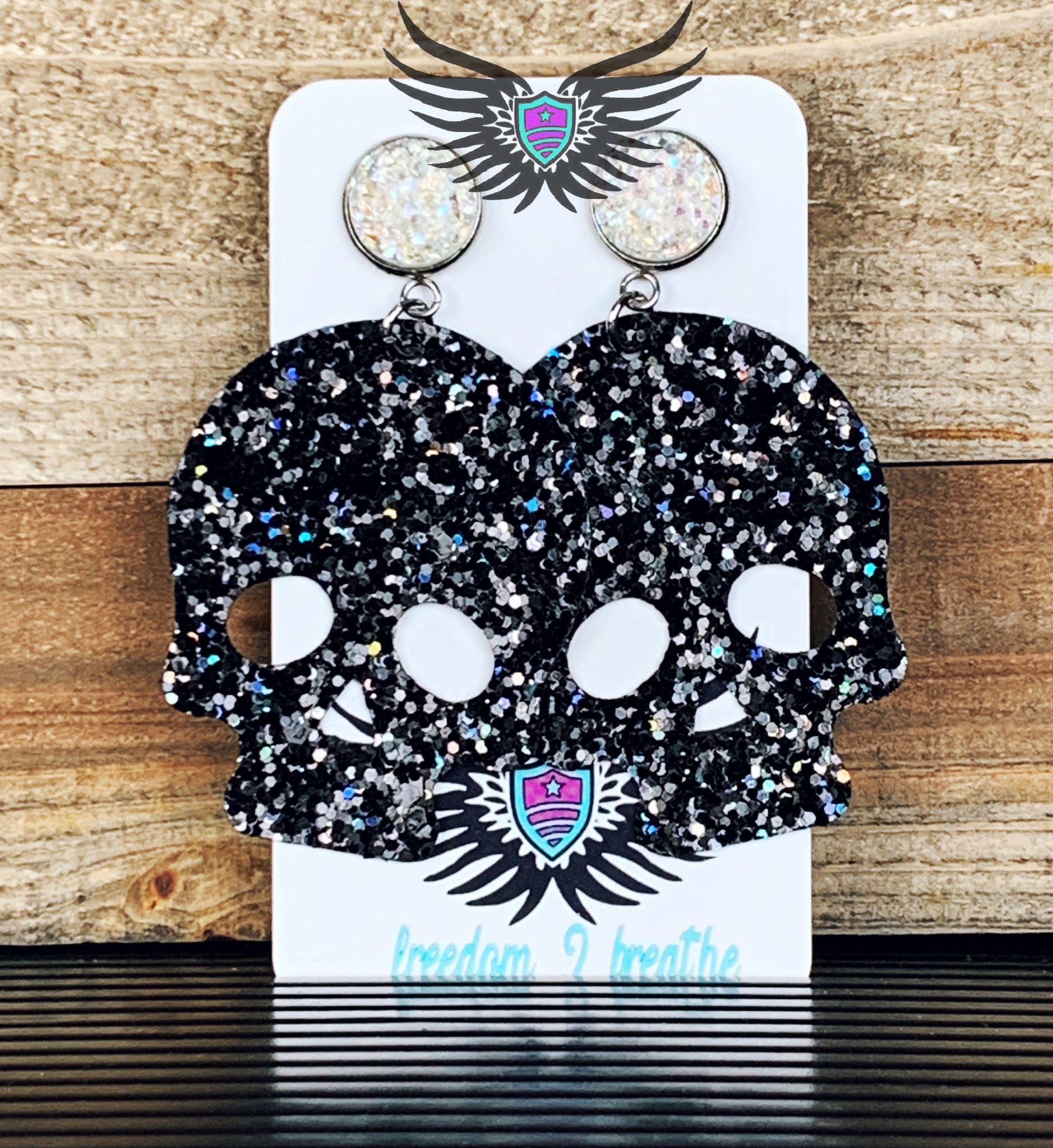 2” Halloween skull earrings made out of faux leather in various colors and prints.